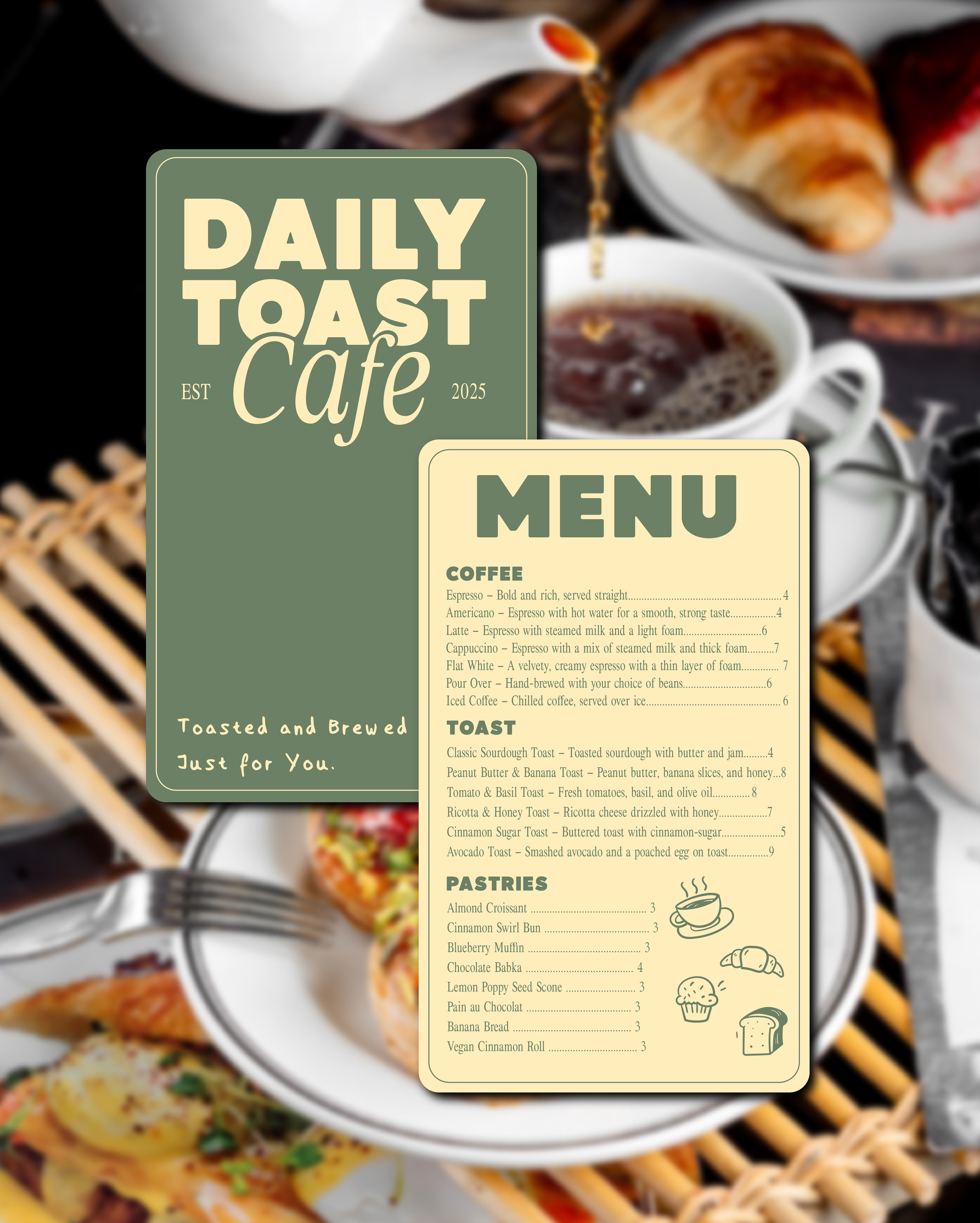 Daily Toast Cafe is a concept for a neighborhood coffee shop built around comfort, connection, and the quiet magic of slow mornings. It’s inspired by the kind of place that feels familiar the moment you walk in—like a memory you didn’t know you missed. The branding leans into soft, earthy tones, classic type, and hand-drawn illustrations to evoke a sense of warmth and nostalgia. It’s simple, welcoming, and just a little bit sentimental—like your favorite mug or the smell of toast on a weekend morning. This concept brings together old comforts and fresh design to create a space that feels like home, even if it’s your first visit.